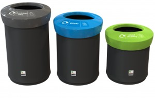 A range of waste and recycling bins in 3 different sizes with attractive, colourful, attention-grabbing lids.